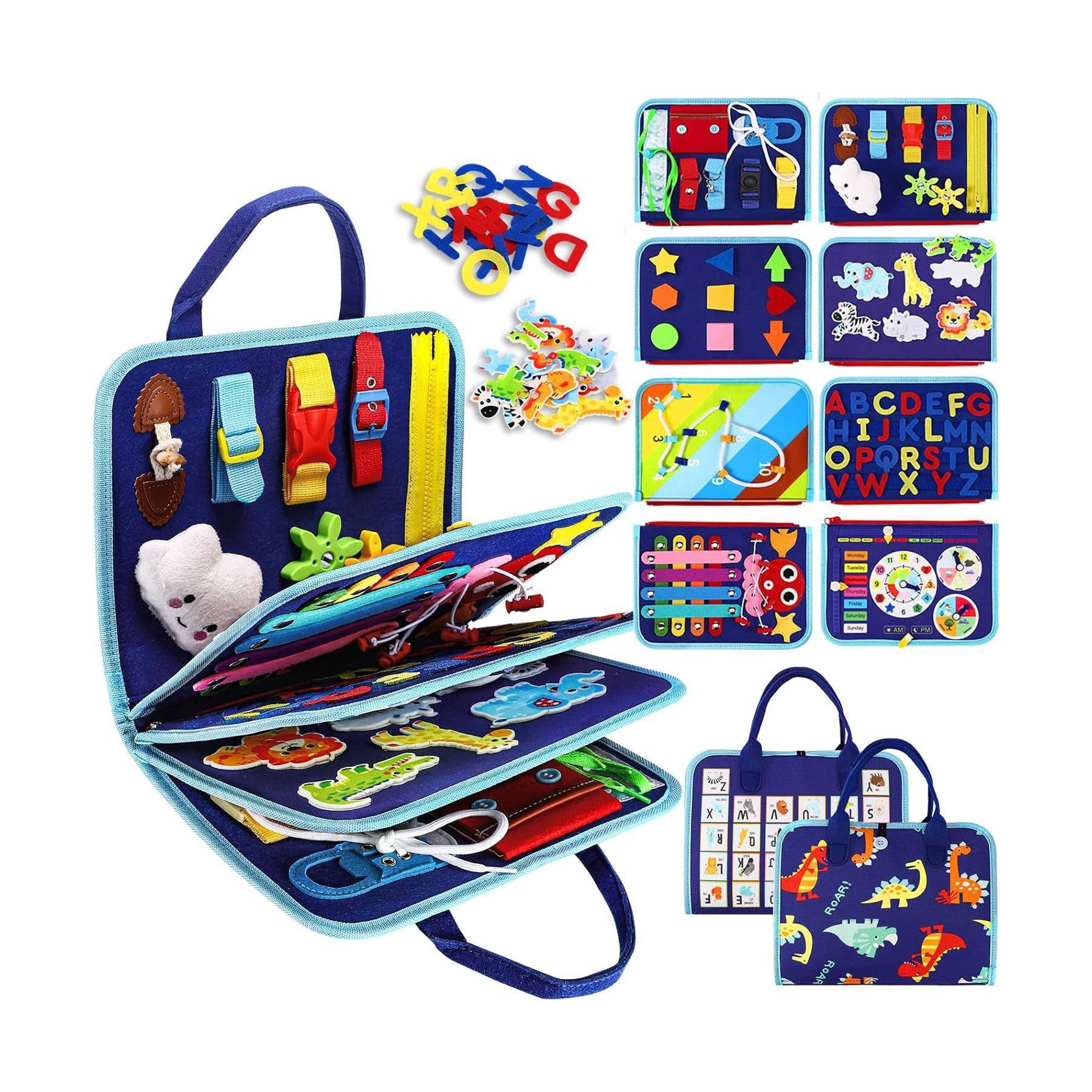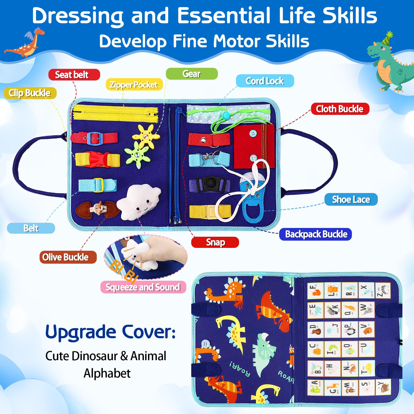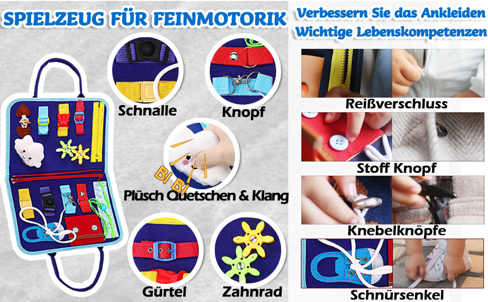 • Compétences de base de la vie quotidienne : La face des compétences quotidiennes contient 15 éléments sensoriels. Les tout-petits apprennent de manière ludique à s'habiller - boucles, boutons-pression, boutons et lacets sont pratiqués. Cela favorise la motricité fine, la pensée logique et la résolution de problèmes.