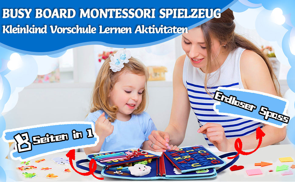 Ce tableau d'activités Montessori à huit faces est le centre d'apprentissage portable ultime pour votre tout-petit. Il offre une activité créative et calme qui soulage les parents et captive les enfants pendant des heures. Le Busy Board encourage le jeu actif et autonome grâce à une variété d'activités.